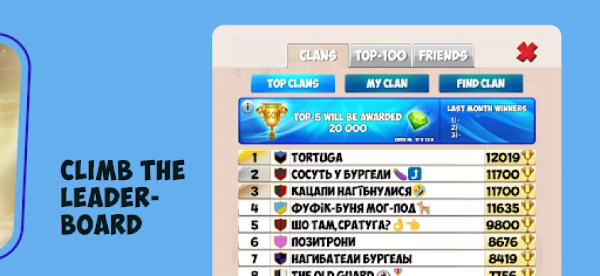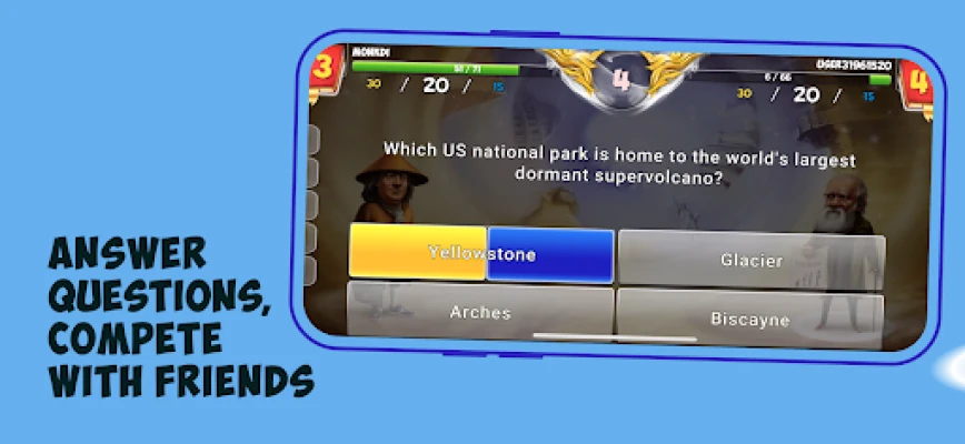 Ponořte se do elektrizujících PvP kvízových soubojů proti hráčům z celého světa! Správné odpovědi ve hře Battle of Geniuses nejenže přidávají body, ale v reálném čase pohánějí útoky vašich hrdinů. Překonejte své soupeře v rychlých vědomostních bitvách, reagujte na jejich znalosti a sledujte, jak se jejich obrana drolí. Ale žádný génius nebojuje sám. Utvořte klan se svými přáteli, spojte své intelektuální síly a bojujte v zábavných týmových bitvách. Stoupejte v globálních žebříčcích, dominujte v top-100 a prokažte svou intelektuální převahu v pravidelných šampionátech. Pro ty nejlepší hráče čekají masivní klanové odměny a nehynoucí sláva. Aréna Battle of Geniuses čeká na vaše jméno – odpovíte na volání?