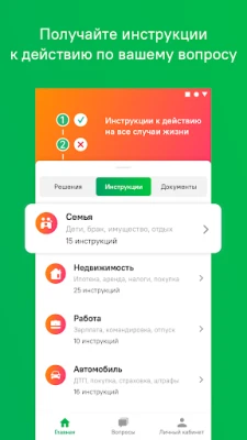 Každá instrukce v «Юрист в Кармане» je pečlivě strukturována do přehledných kroků, což vám umožní snadno sledovat postup a označovat již splněné úkoly. Hledání potřebného řešení je intuitivní; například pro registraci manželství jednoduše zvolíte sekci Rodina a následně Registrace manželství, kde naleznete detailní algoritmus s vysvětlivkami ke každému kroku. V některých případech vám aplikace položí jednoduché otázky, aby mohla doporučit ještě přesnější a relevantnější řešení ušité přímo na míru vaší situaci. Pro vaše pohodlí si můžete pokyny uložit do svého osobního profilu, tisknout je, odeslat e-mailem nebo k nim kdykoli později vrátit či je odstranit.